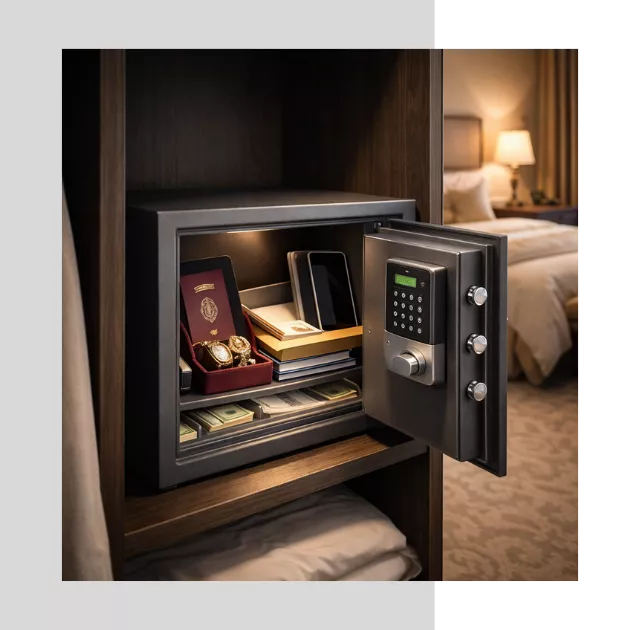 It is utilized for the safe storage of guest valuables such as cash, passports, jewelry, and documents within hotel rooms.